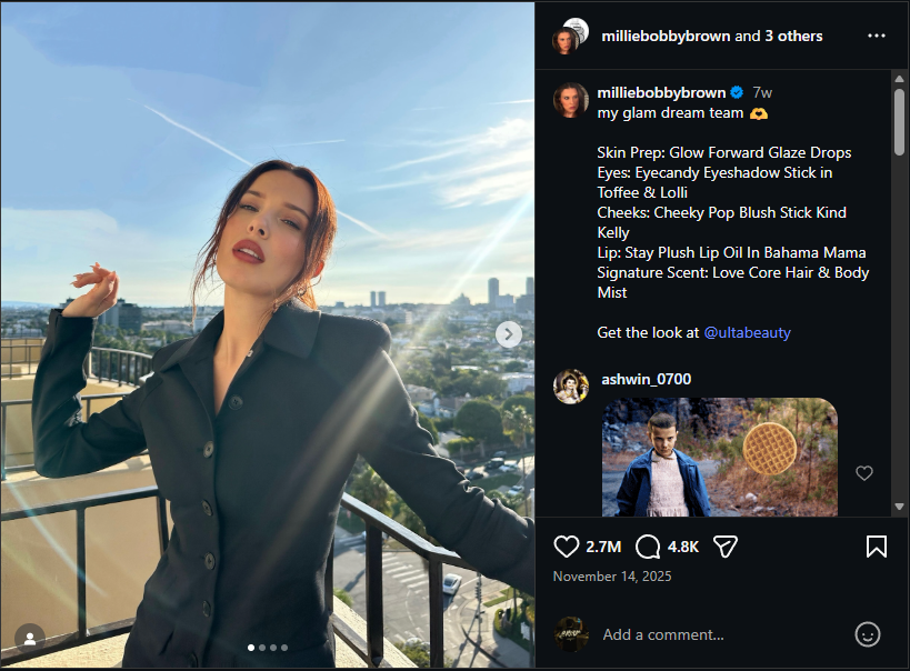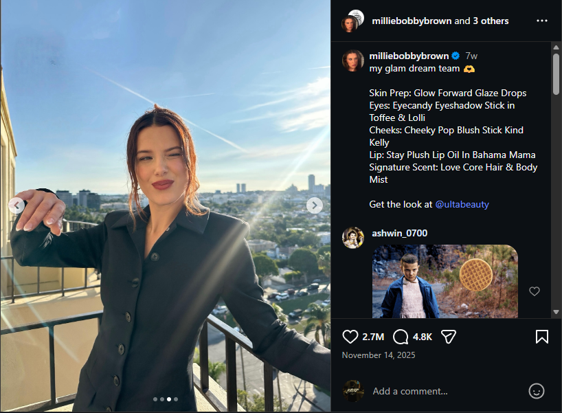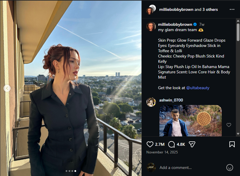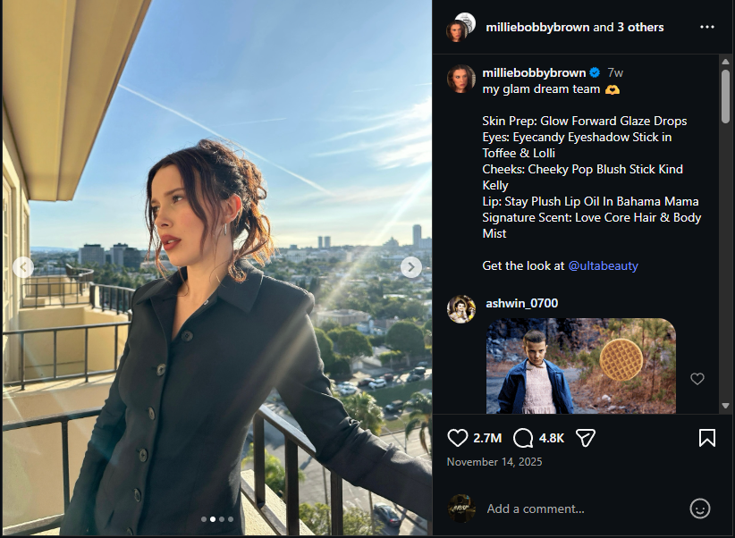 The images examined in this investigation come from a post on Millie Bobby Brown’s Instagram, published on 14 November 2025.