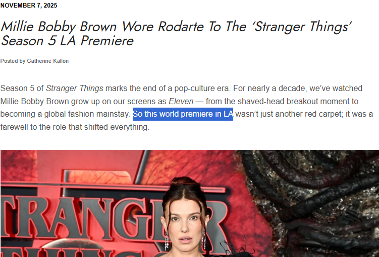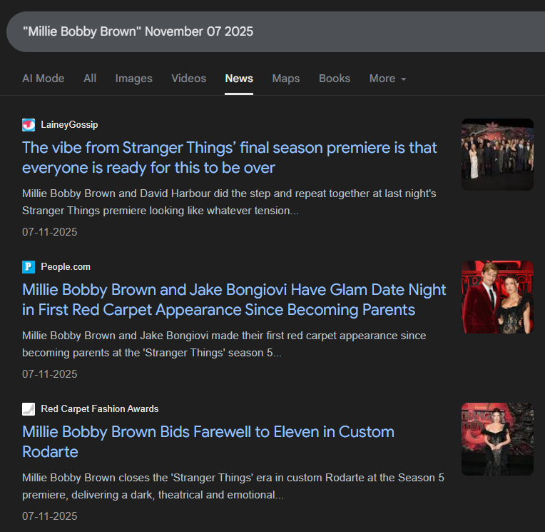 With a likely timeframe established, the next step is to determine what Millie Bobby Brown was doing on 7 November 2025 and whether her public appearances around that date provide any location-based context.